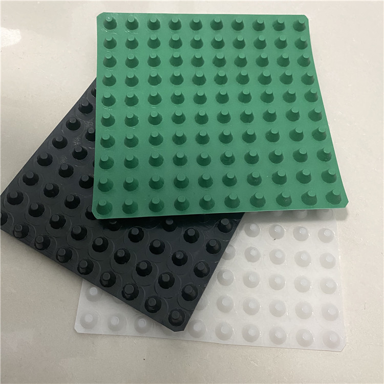 圓錐突臺(tái)的頂面膠接一層過(guò)濾土工布,以阻止泥土微粒通過(guò),從而避免排水通道阻塞使孔道排水順暢。 傳統(tǒng)的排水方式使用磚石瓦塊作為導(dǎo)濾層、使用較多的鵝卵石或碎石作為濾水層、將水排到指定地點(diǎn)。而用排水板取代鵝卵石濾水層來(lái)排水則省時(shí)、省力又節(jié)能、節(jié)省投資、還能降低建筑物的荷載。